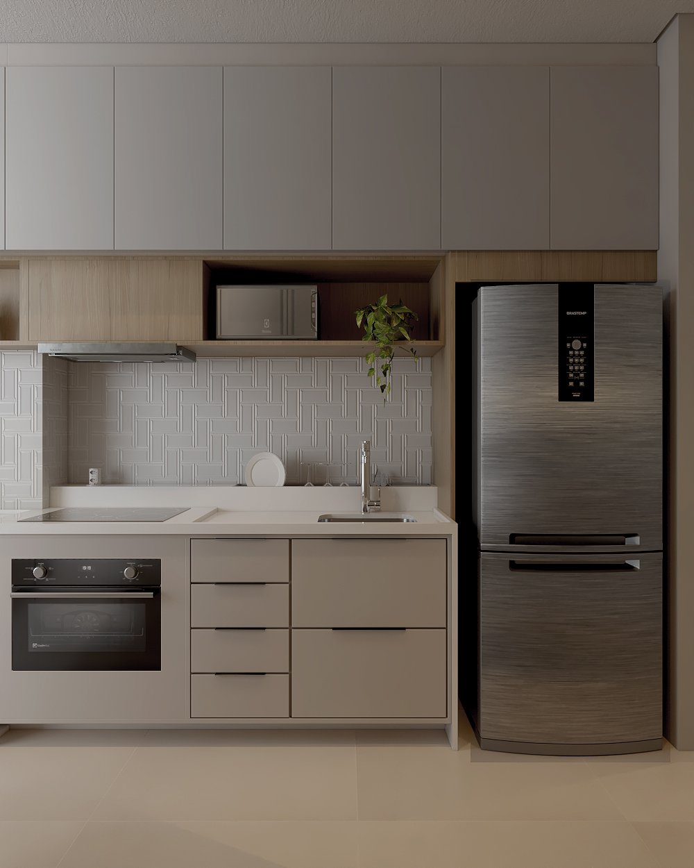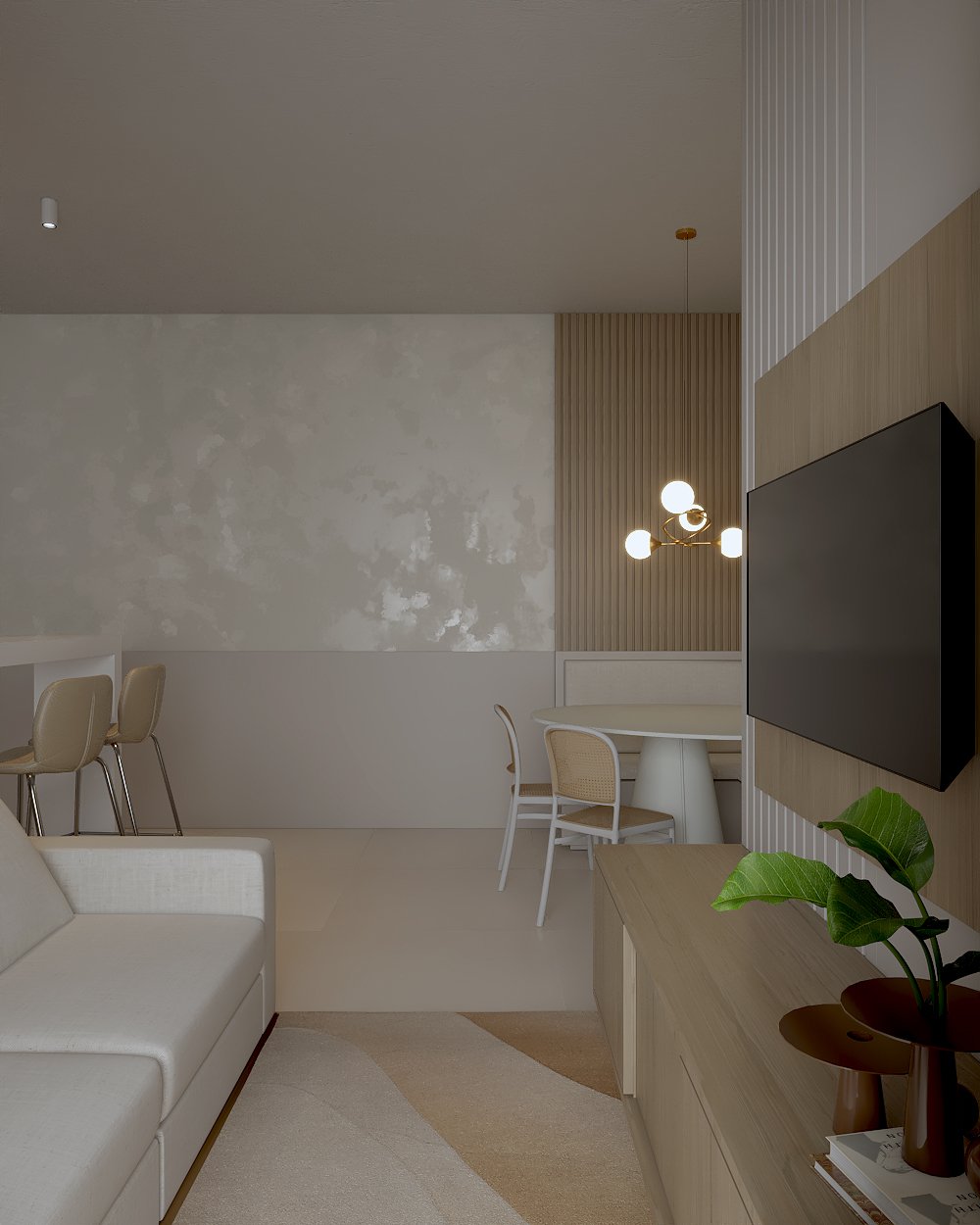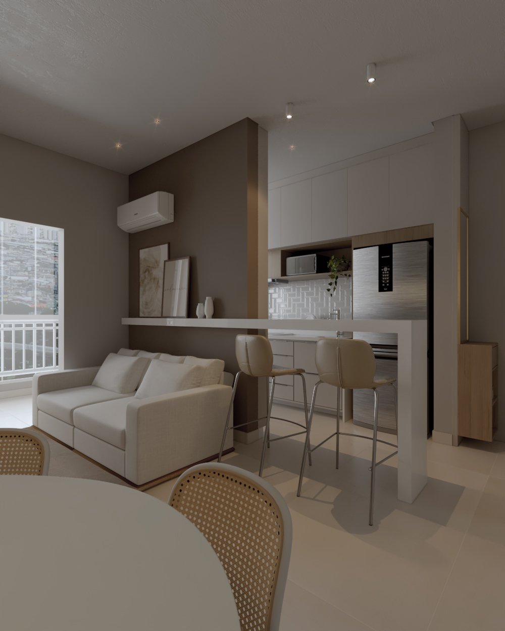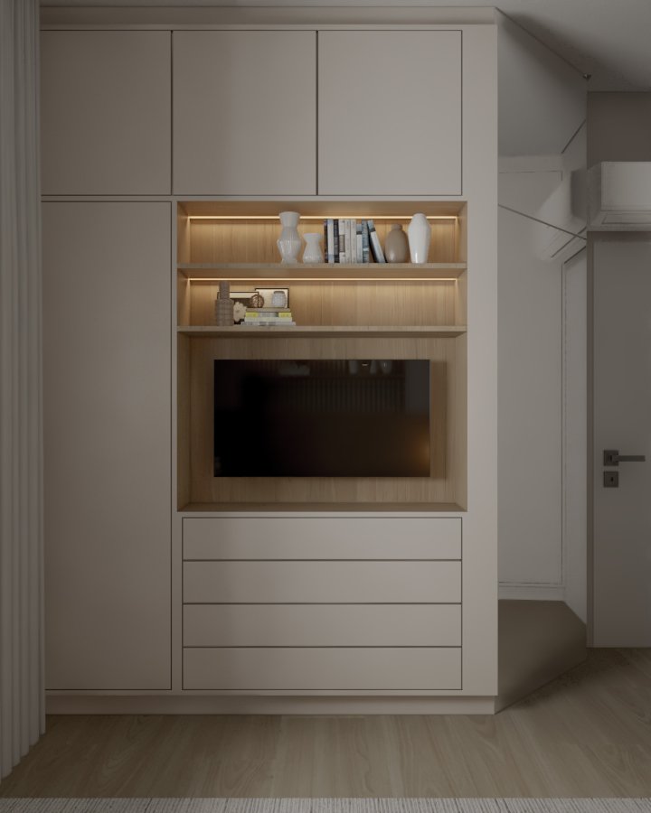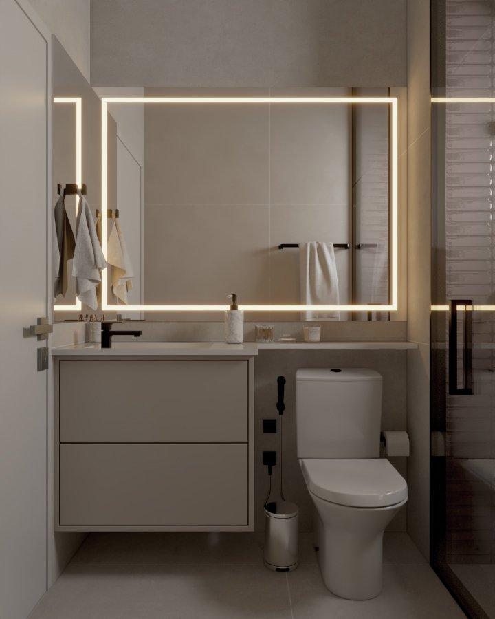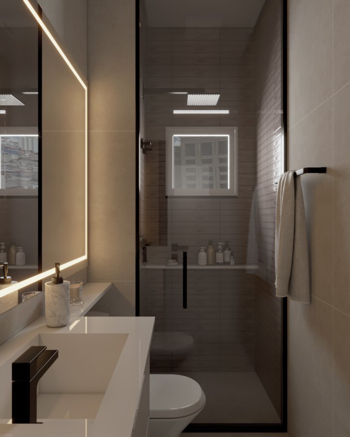 Neste projeto, a principal demanda do casal era um ambiente moderno, funcional e com estética clean, utilizando cores sóbrias. Com uma planta compacta e ambientes integrados, a cozinha e a lavanderia exigiram soluções inteligentes: eliminamos a parede que separava a lavanderia da varanda, criando um único espaço integrado com a área gourmet.
