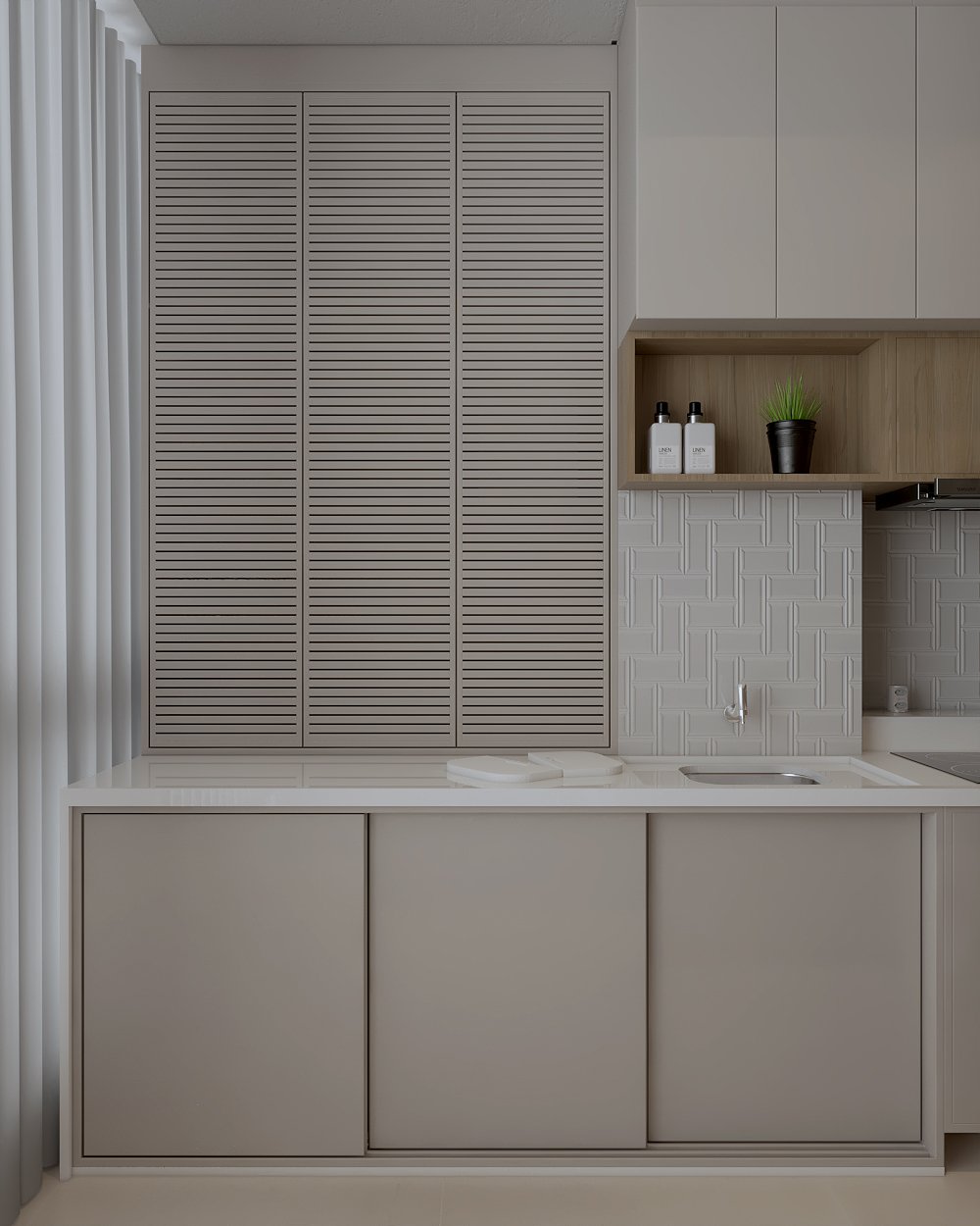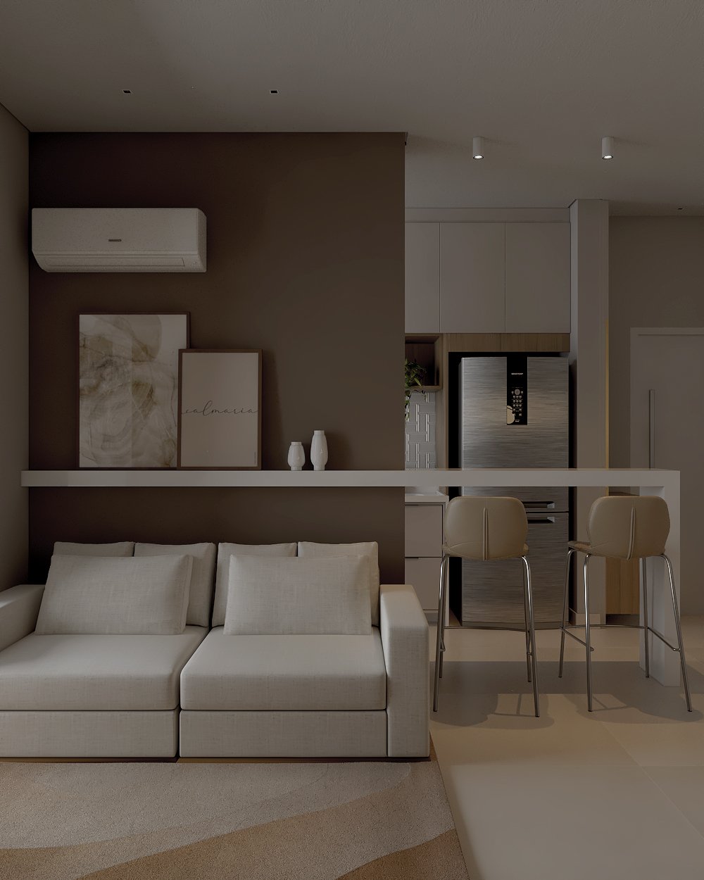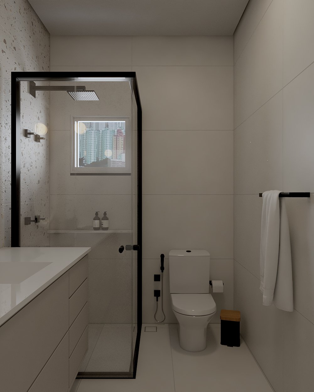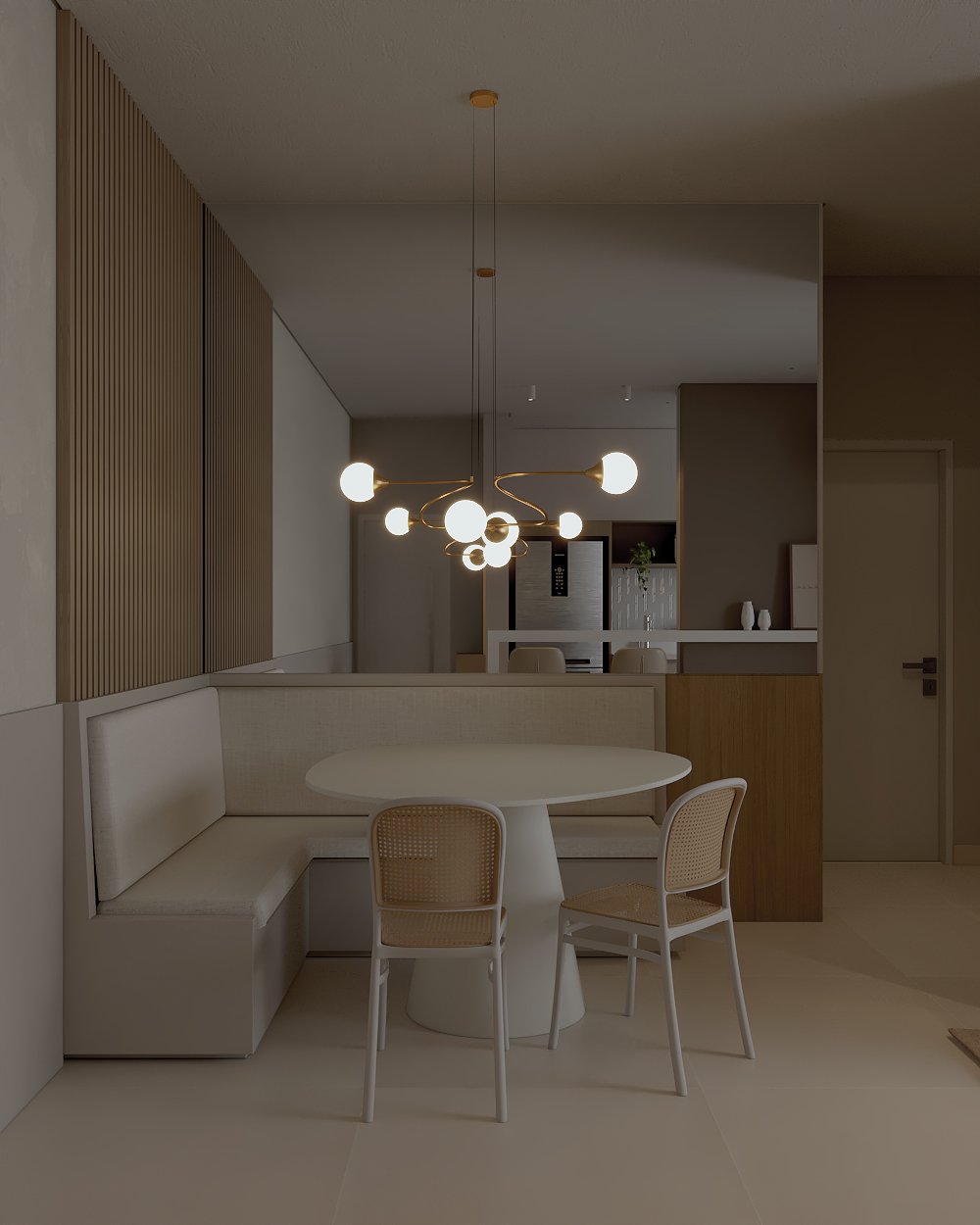 Neste projeto, a principal demanda do casal era um ambiente moderno, funcional e com estética clean, utilizando cores sóbrias. Com uma planta compacta e ambientes integrados, a cozinha e a lavanderia exigiram soluções inteligentes: eliminamos a parede que separava a lavanderia da varanda, criando um único espaço integrado com a área gourmet.