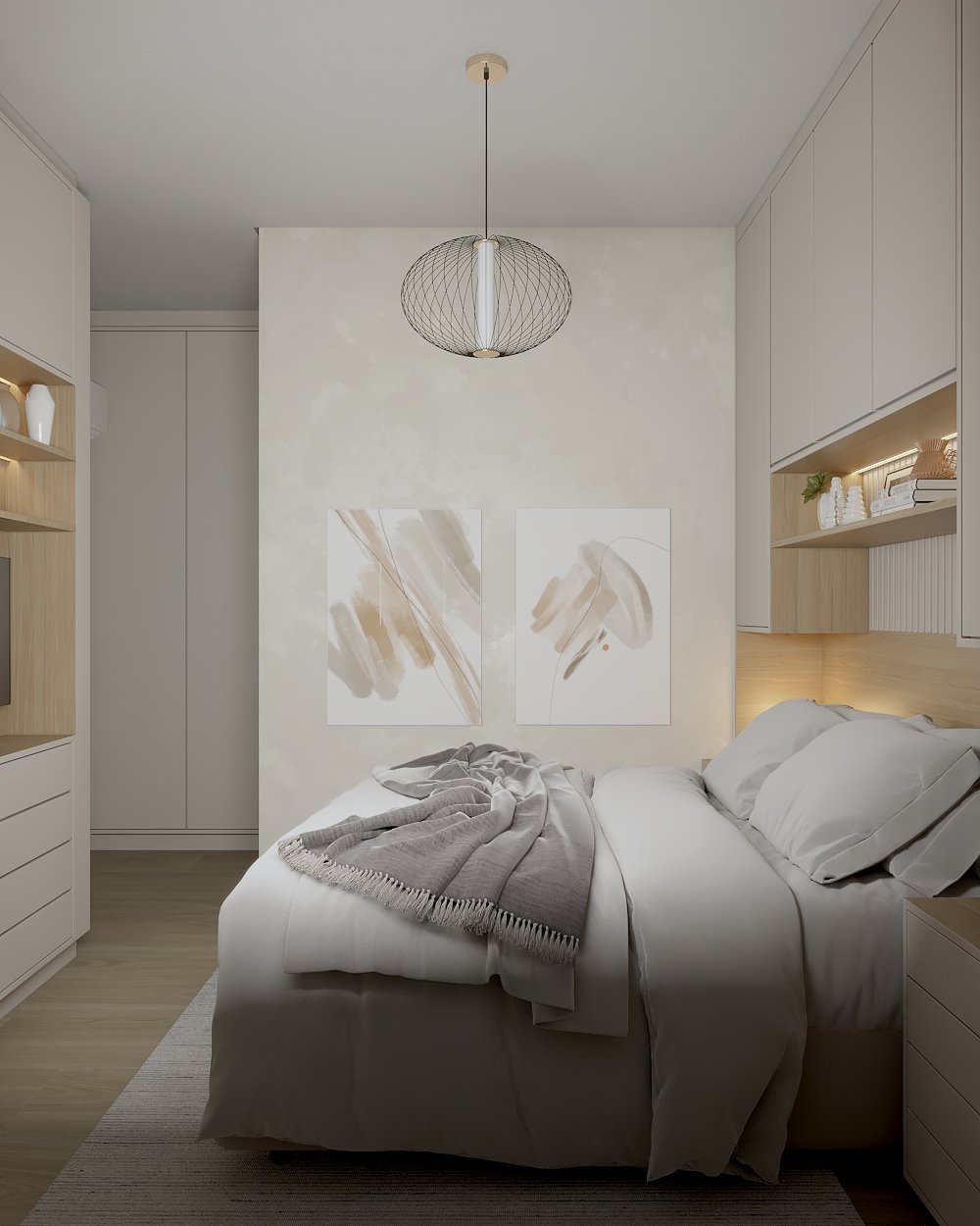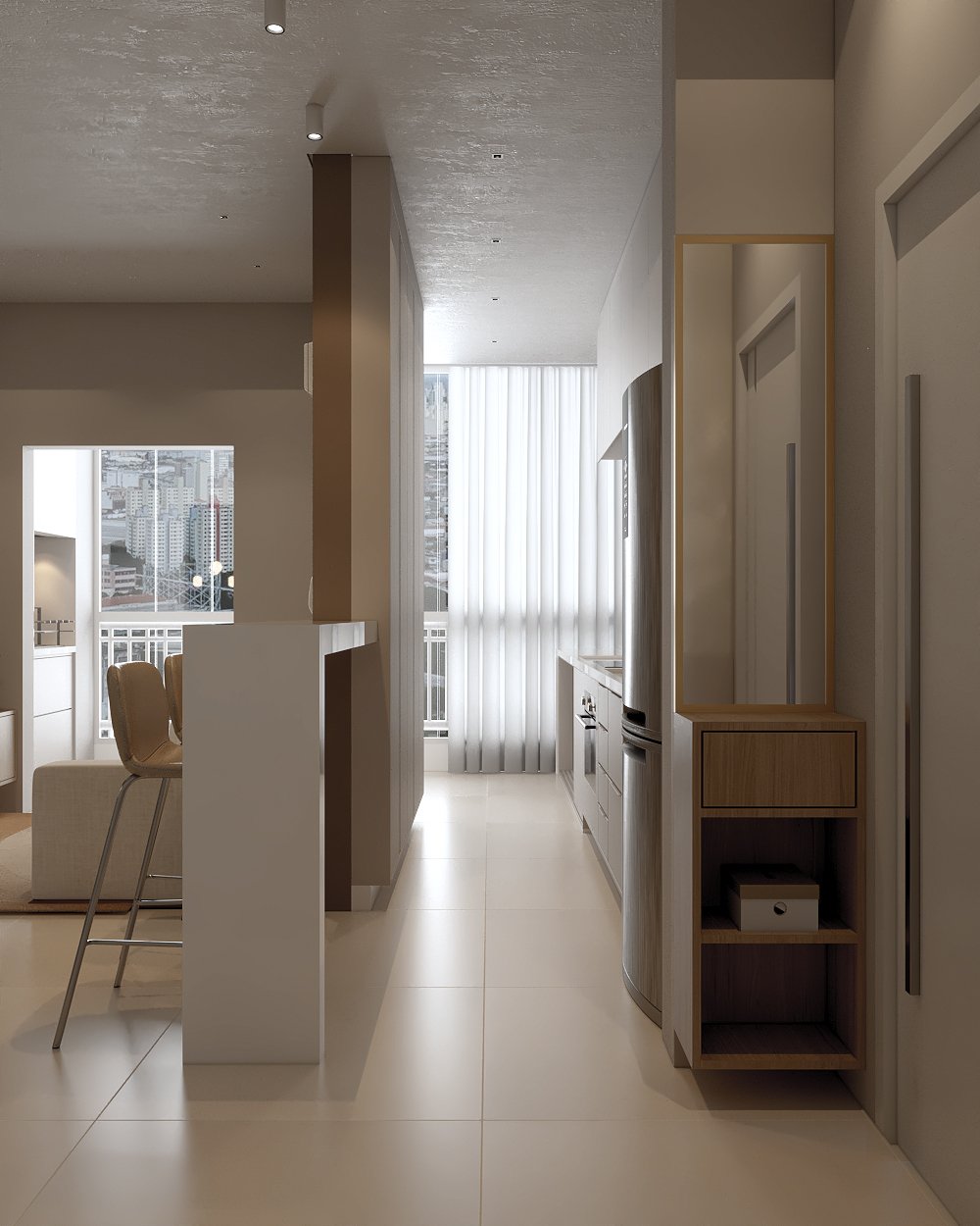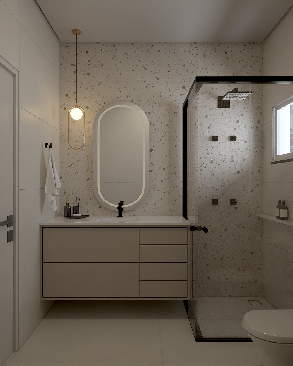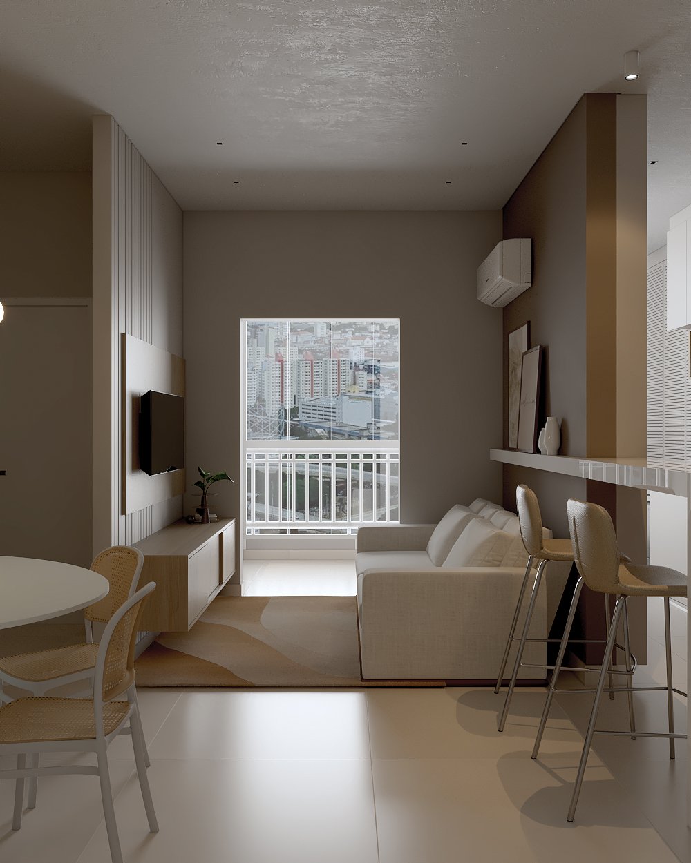 Neste projeto, a principal demanda do casal era um ambiente moderno, funcional e com estética clean, utilizando cores sóbrias. Com uma planta compacta e ambientes integrados, a cozinha e a lavanderia exigiram soluções inteligentes: eliminamos a parede que separava a lavanderia da varanda, criando um único espaço integrado com a área gourmet.
