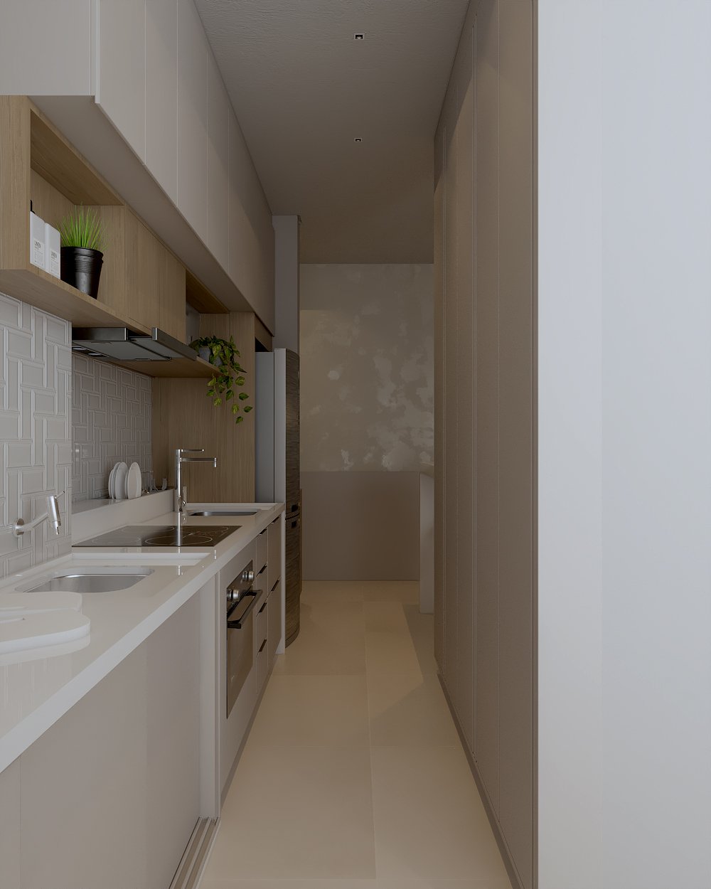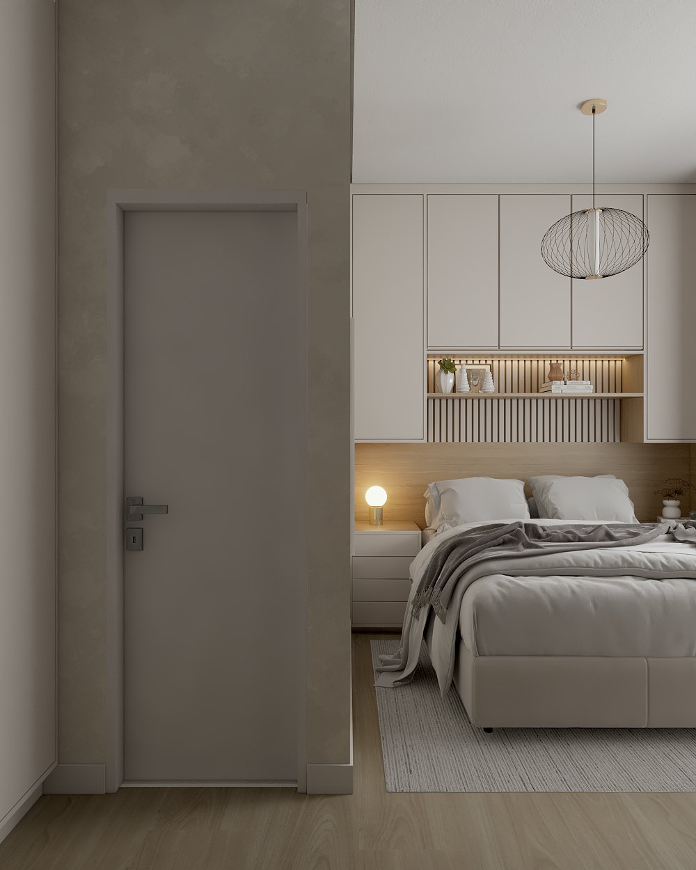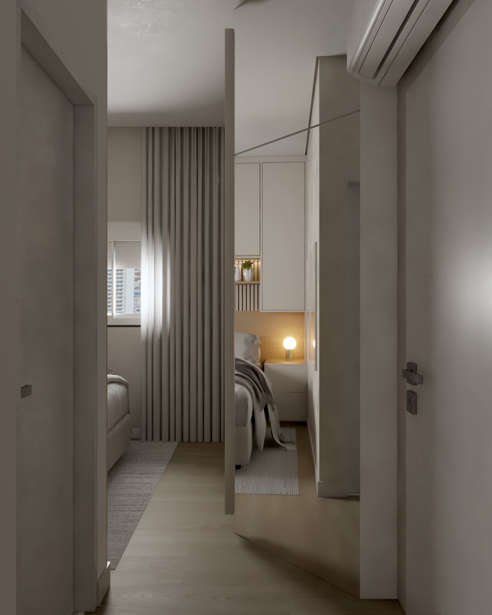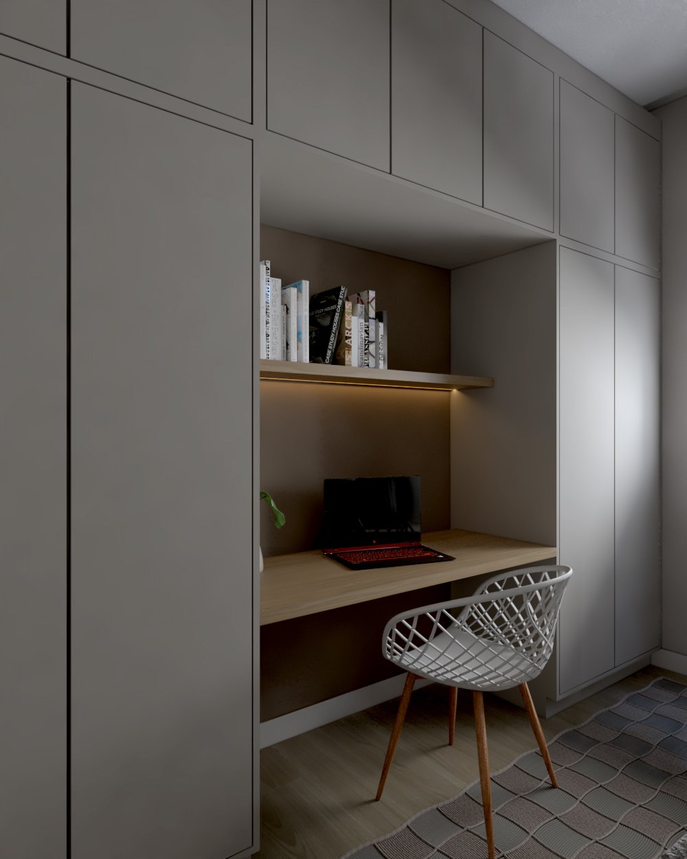 Neste projeto, a principal demanda do casal era um ambiente moderno, funcional e com estética clean, utilizando cores sóbrias. Com uma planta compacta e ambientes integrados, a cozinha e a lavanderia exigiram soluções inteligentes: eliminamos a parede que separava a lavanderia da varanda, criando um único espaço integrado com a área gourmet.