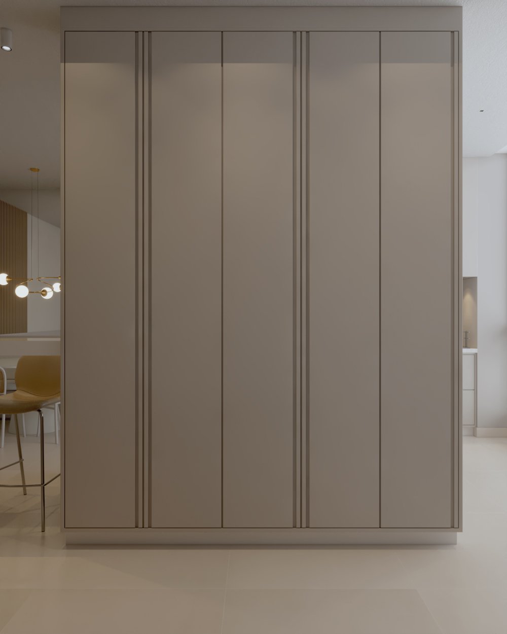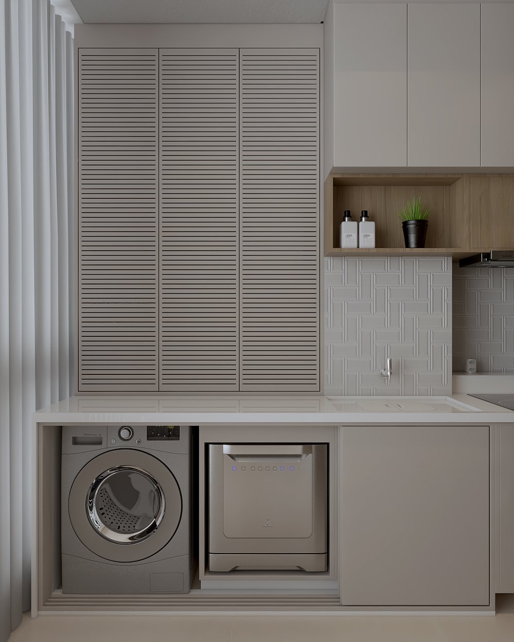 A lava-louças foi posicionada ao lado da lava e seca, e disfarçada com portas de correr, garantindo praticidade sem comprometer a estética da cozinha.