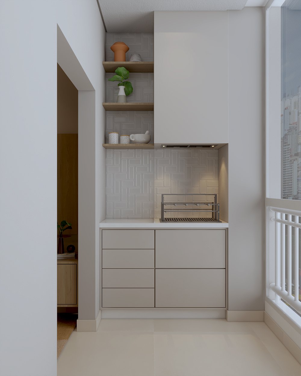 A varanda foi fechada com vidro, abrigando a churrasqueira em um layout fluido e conectado com a cozinha. Para atender ao desejo dos clientes de incluir uma lava-louças e calha úmida, aproveitamos a profundidade do shaft da lavanderia e elevamos esse nicho, permitindo a instalação de uma calha úmida retangular e torres de tomada embutidas na bancada.